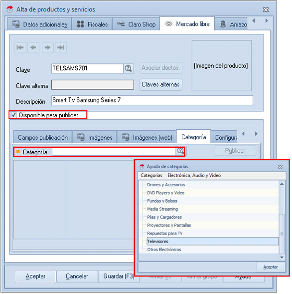 En la pestaña Mercado Libre, habilita la opción de Disponible para publicar y selecciona la Categoría donde se publicará el producto.