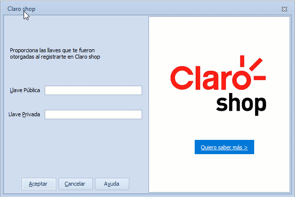 Nota: para acceder a la tienda, ingresas la llave pública y llave privada, que fueron proporcionados por la tienda virtual Claro Shop al completar el registro como vendedor.