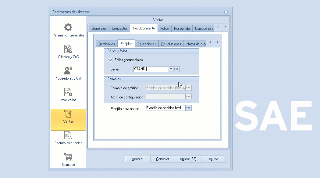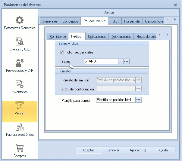 - Registro de folios para pedidos: ingresas desde el Menú Configuración, te diriges a Parámetros del sistema, pulsa Ventas, presionas Por documento y das clic en Pedidos.