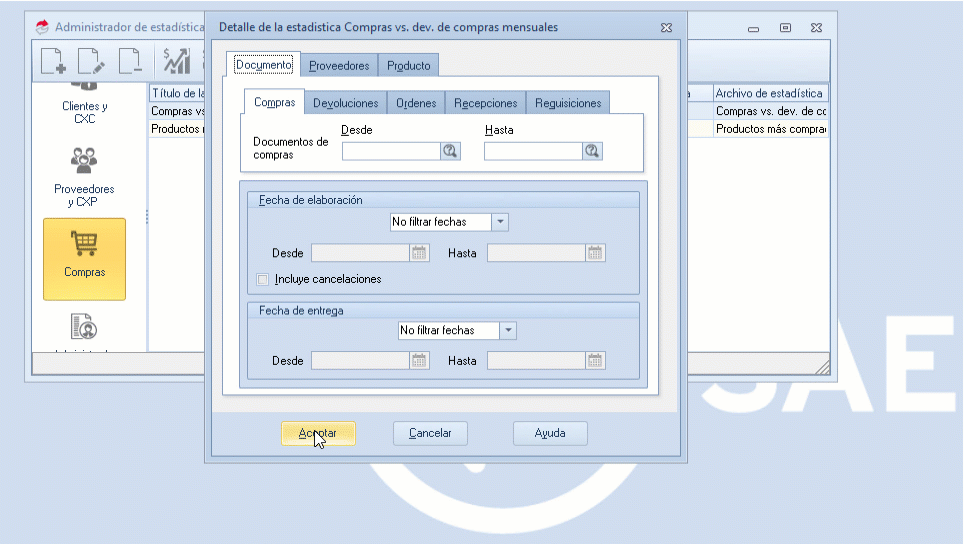 Este proceso te permite consultar estadísticas, ya sean las que se instalan junto con el sistema SAE o las creadas por los usuarios, para obtener información relevante y facilitar el análisis de datos.