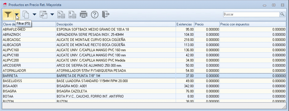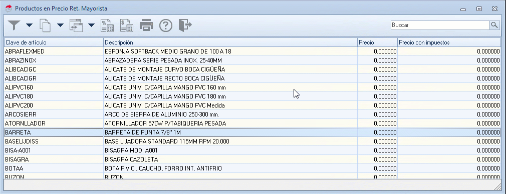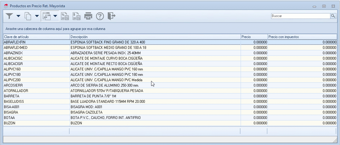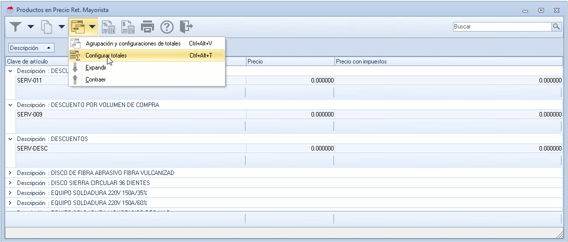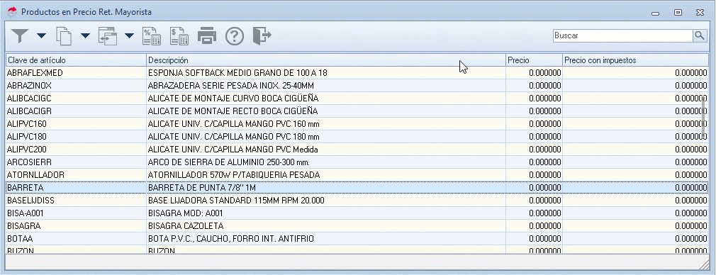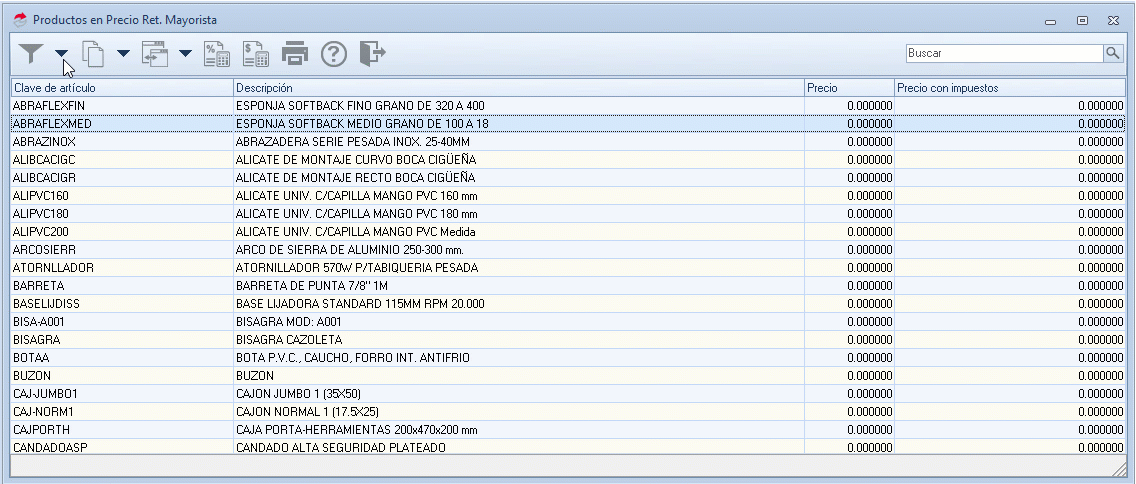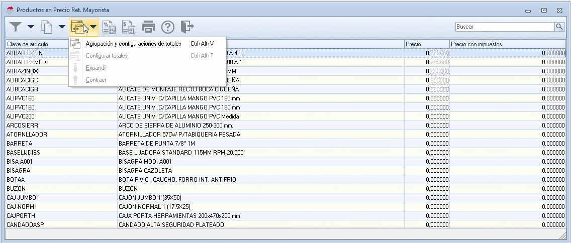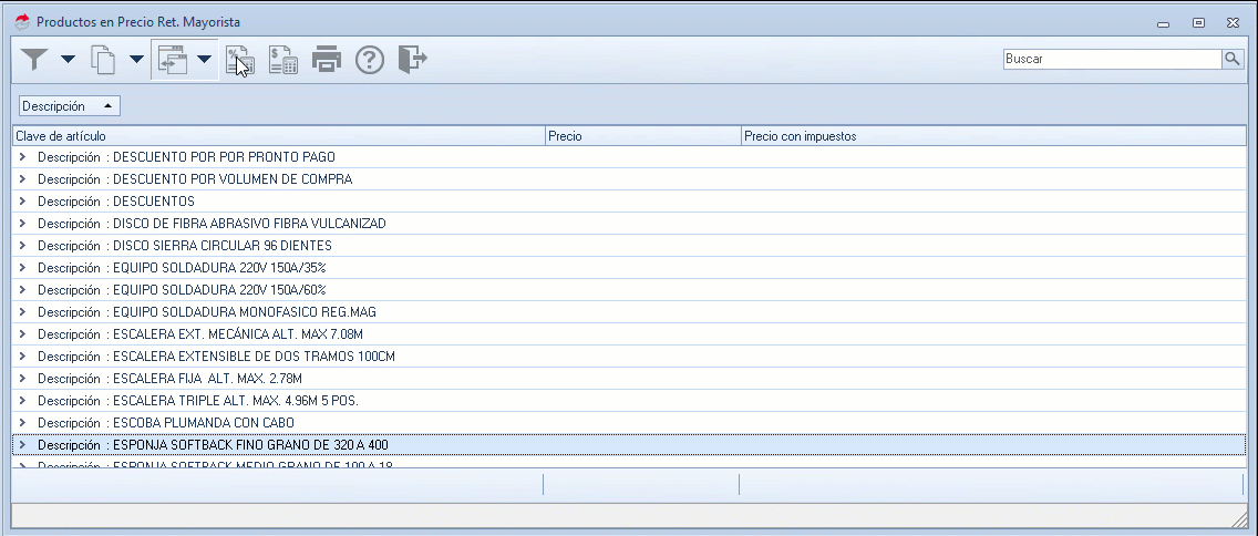En la ventana del catálogo, elige la lista que deseas consultar y, en la barra de herramientas, haz clic en el ícono Desplegar lista de precios