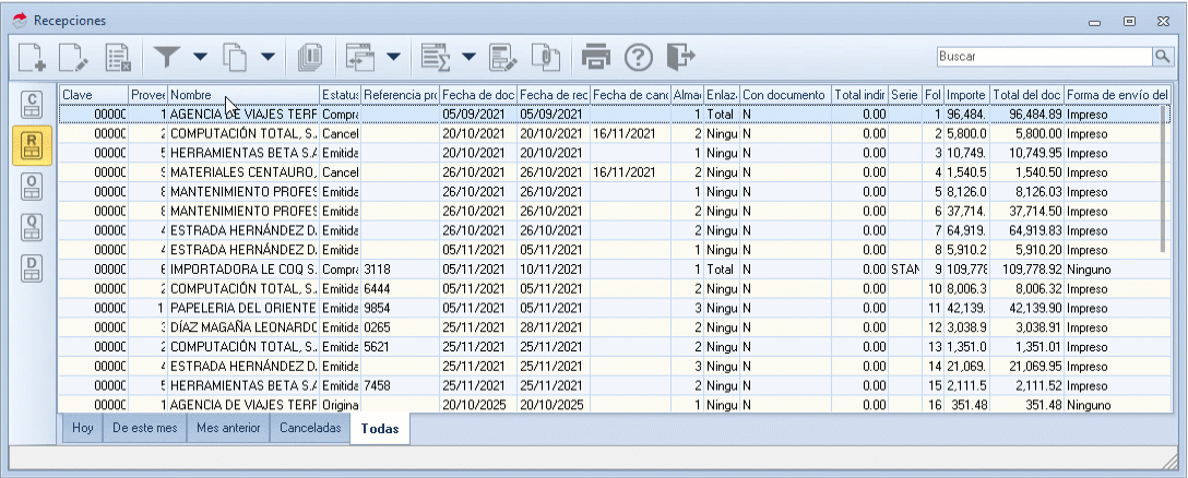 - Canceladas: enlista únicamente los documentos de recepciones que han sido anulados o cancelados.