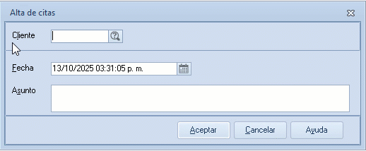 Se mostrará la ventana Alta de citas, donde es necesario completar la siguiente información: