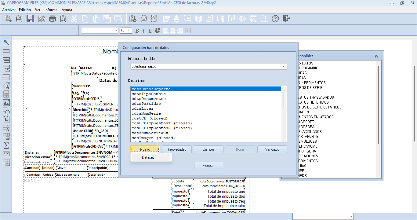 Importante: es necesario tener en cuenta los nombres de las tablas y campos de la base de datos del sistema para configurar correctamente un Dataset. Esto asegurará que la sentencia SQL y las relaciones entre datasets se definan de manera precisa, garantizando la correcta integración de la información.