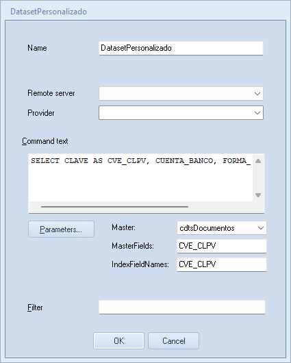 Importante: es fundamental que conozcas los nombres de las tablas y campos de la base de datos del sistema al configurar un Dataset. Esto te permitirá que la sentencia SQL y las relaciones entre conjuntos de datos se definan correctamente, asegurando así una integración precisa de la información.
