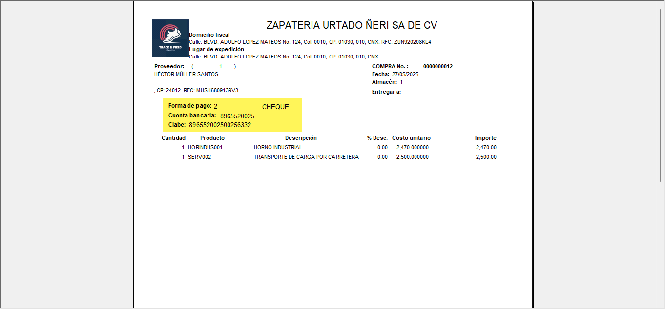 - En la emisión de la compra se muestra la información bancaria del beneficiario (proveedor), forma de pago, cuenta de banco y Clabe.