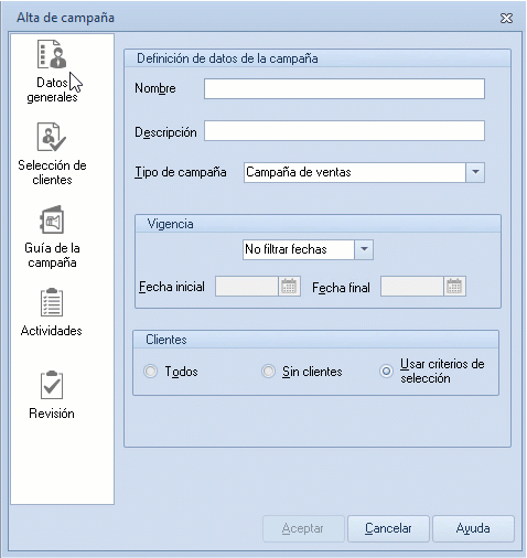 Con esta opción se crean campañas que contenga una selección de criterios aplicados a la información de los clientes, así como actividades asignadas para la misma. Esto con el fin de proporcionar una herramienta que permita clasificar la información de los clientes.