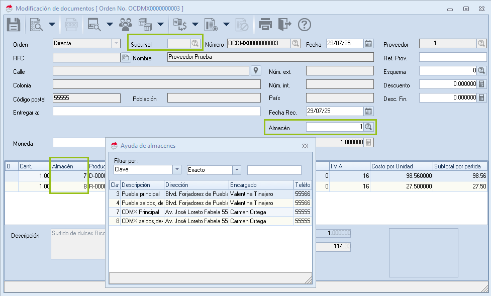 - El campo almacén de la cabecera y partida, es posible cambiar los almacenes, sin embargo, se podrán seleccionar solo los almacenes asociados a las sucursales a las que se encuentre asignado el usuario.