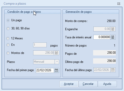 - Un pago: el importe del documento se cubrirá en un solo pago, que se efectuará en la fecha indicada en el campo Fecha del primer pago y sin enganche.