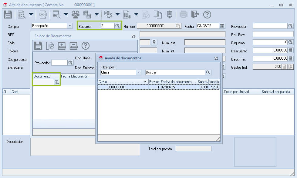 Al generar el enlace del documento de compra, el sistema realiza un filtrado para seleccionar solo los documentos de la sucursal seleccionada.
