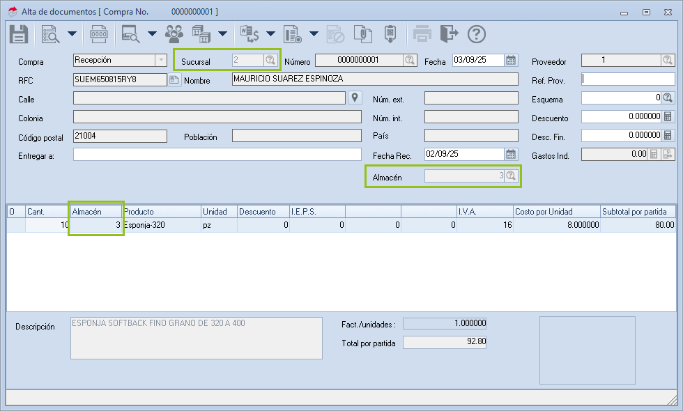 - Aunque los almacenes indicados en la cabecera o en las partidas no correspondan a la sucursal seleccionada, el sistema permitirá guardar el documento.