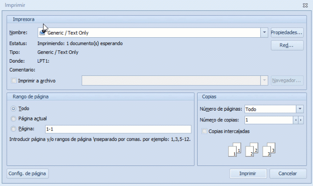 - Rango de página: indicas si quieres imprimir todo, la página actual o especifica el número de la página.