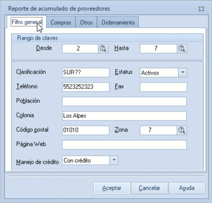 - Datos generales: los campos Teléfono, Fax, Colonia, Población, Código Postal y Correo electrónico son información específica del Proveedor, que se mostrará al momento de emitir el reporte.