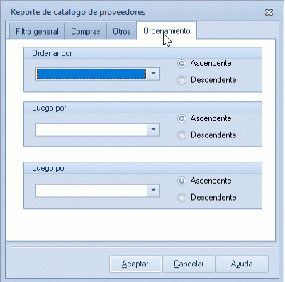 - Ordenar por: selecciona el campo o columna principal para organizar los datos; el sistema permite ordenarlos de manera ascendente o descendente, siendo ascendente la opción por omisión.