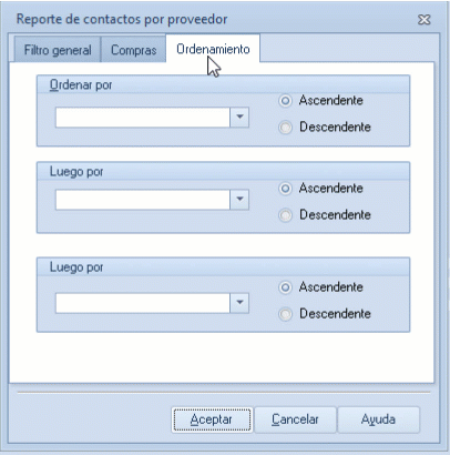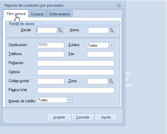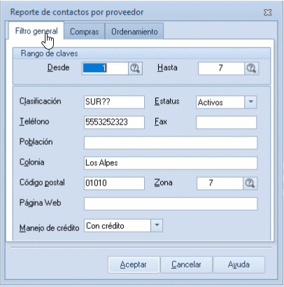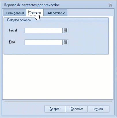 - Compras anuales (Inicial / Final): especifica un rango de valores para generar un reporte con base en el monto anual de compras realizadas a los proveedores.