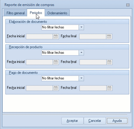 - Elaboración de documento, recepción de producto y pago de documento: filtra los registros mediante las siguientes opciones: