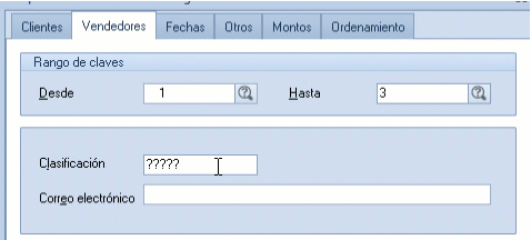 - Clasificación: elige la zona a la que se encuentra asignado el vendedor. Por omisión se incluyen cinco caracteres «?????», lo cual significa que se incluirán todos los registros.