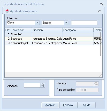 Valor específico | Administrador | Se muestran todos los almacenes de la sucursal especificada |
