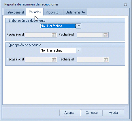 - Elaboración de documento y recepción de producto: filtra los registros mediante las siguientes opciones: