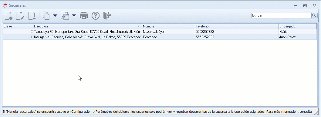 2. Se abrirá en automático la consulta de sucursales, selecciona la sucursal y dentro de la barra de herramientas pulsa el ícono Modificar