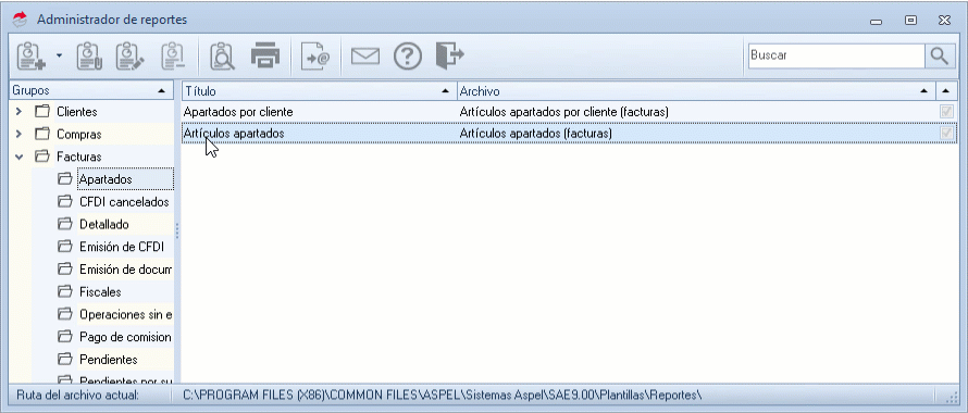 En la parte izquierda de la ventana se muestran los grupos y subgrupos de reportes disponibles, clasificados por tipo: